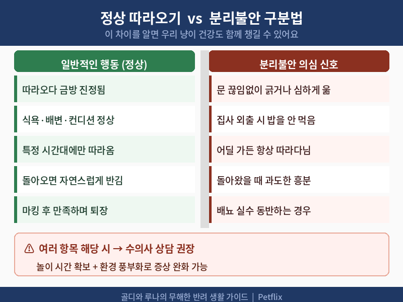 ✔ 분리불안이 원인이라면 단순 애정 표현과 구분 필요 — 수의사 상담 권장